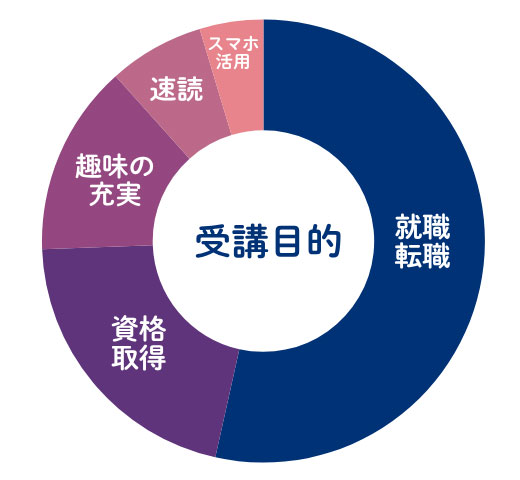 受講目的としては、初心者の方がが多く、転職活動や資格取得、仕事でのスキルアップを目指す方々に支持されています。