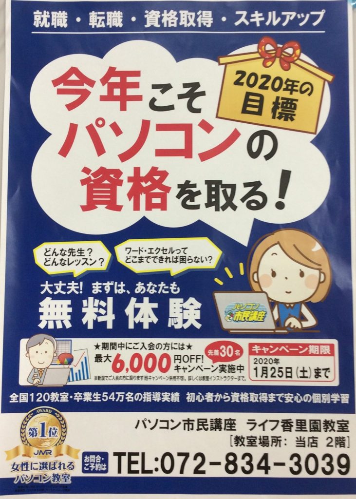 京阪香里園駅下車徒歩1分 ライフ香里園店の2階にあるパソコン市民講座 ライフ香里園教室です。