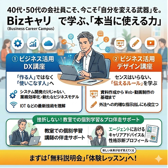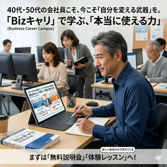ビジネスの現場で「本当に使える力」を身に付け、キャリアを劇的に変えるための学びの場、「Bizキャリ (Business Career Campus)」の魅力をご紹介します!