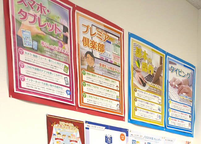 壁に貼ってあるカラフルなポスターには、スマホ講座、タッチタイピング、趣味の写真整理、タブレット講座などが並び、学べる内容の幅広さがひと目でわかります。