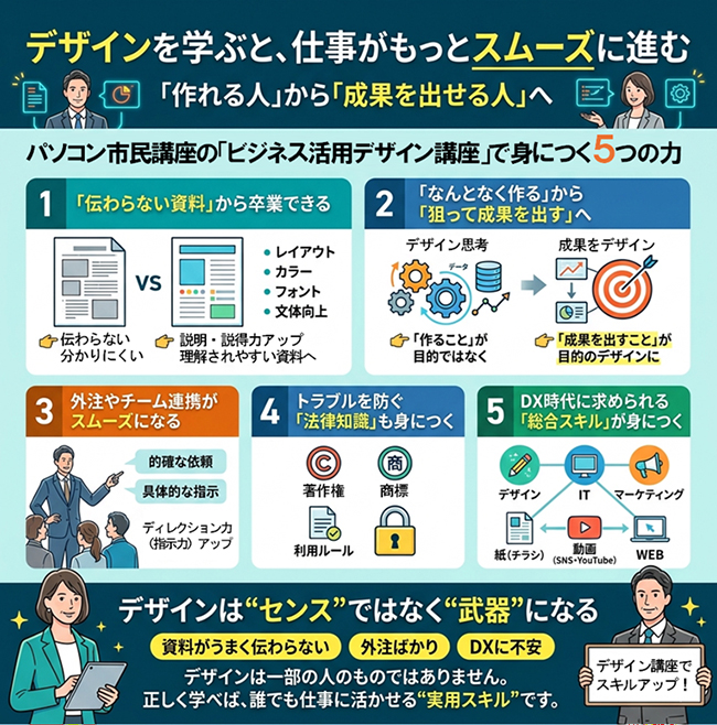 デザインは”センス”ではなく、“武器”になる。パソコン市民講座のビジネス活用デザイン講座で得られるのは、現場でそのまま使えるスキルです。