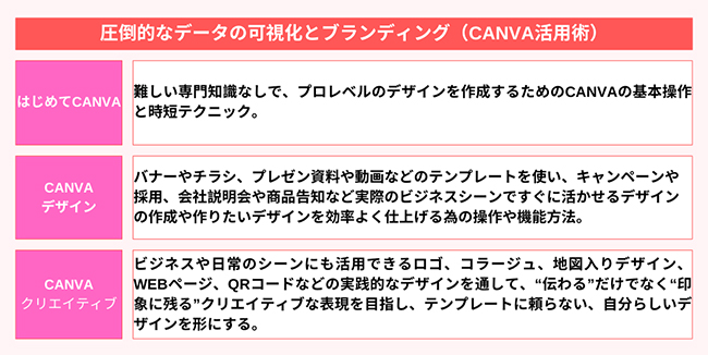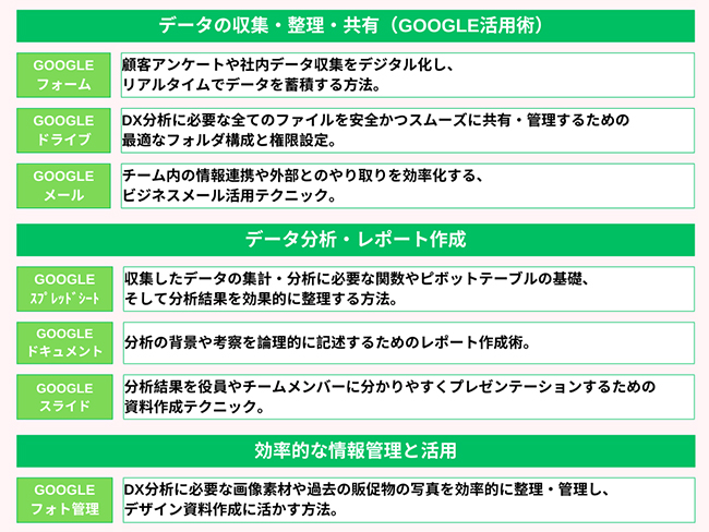 この講座は、煩雑な手作業によるデータ分析から脱却し、AI時代に求められる効率的かつ効果的なDX分析スキルを習得することに特化しています。データの「収集」「整理」「分析」「可視化」といった一連のプロセスを、すべてGoogleとCanvaの最新ツール群で完結させる手法を学びます。