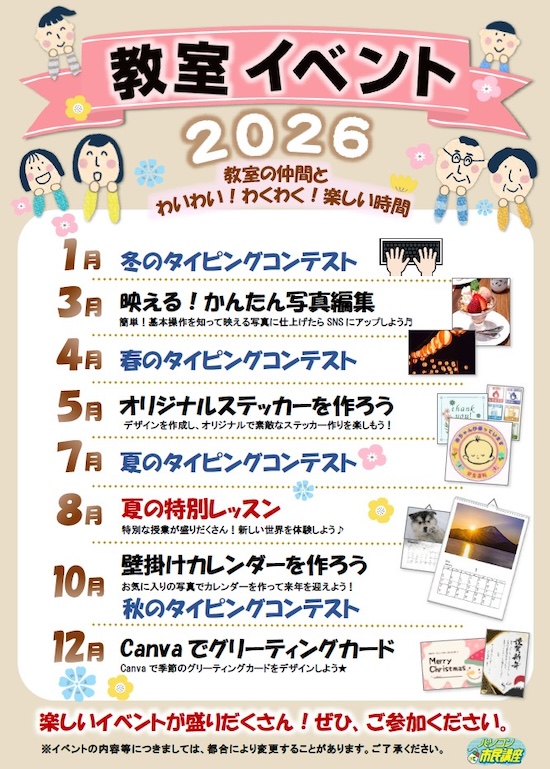 パソコン市民講座ではパソコンの基本操作から応用まで幅広く学べるカリキュラムが用意されています。その中のひとつに「イベント」という一斉授業があります。