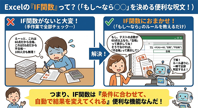 IF関数は「もし〇〇なら△△、そうでなければ□□」という条件判断を自動で行います。