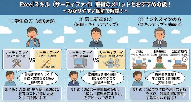 実は、エクセルスキルは多くの仕事で必要とされるため、資格として証明できると就職や転職で大きな強みになります。