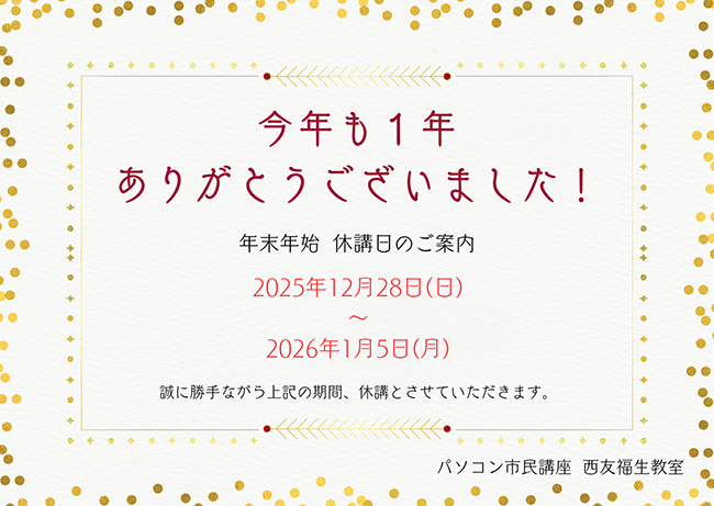 「パソコン市民講座」では、このように受講生の皆様が学習で身に付けたスキルを活かして、より一層楽しくパソコンやiPad・iPhoneなどを日頃から使っていただき、便利な生活を送るためのITスキルを「すべての世代の方々に」ご提供させていただくため、これからも教室運営を行ってまいります。