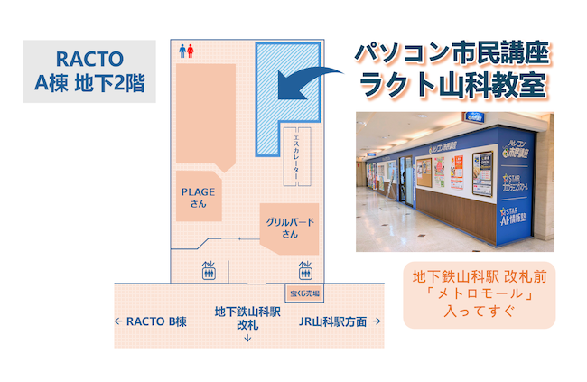 パソコン市民講座 ラクト山科教室は、JR山科駅・京阪電車京津線 京阪山科駅から徒歩2分、地下鉄東西線山科駅から徒歩1分のラクトA棟 地下2階にございます。
