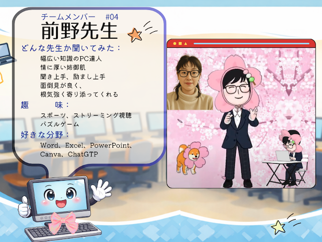 私自身、旅行や季節の行事の写真を使って、ワードやパワーポイント、Canva、ChatGPTなどで加工したり、オリジナル作品や動画を作ることが大好きです。楽しみながらスキルを身につけることが、上達への一番の近道だと考えています。