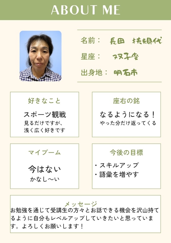 日々、受講生の皆さんとお話ができる事を楽しみにしています。一緒にスキルアップしましょう!