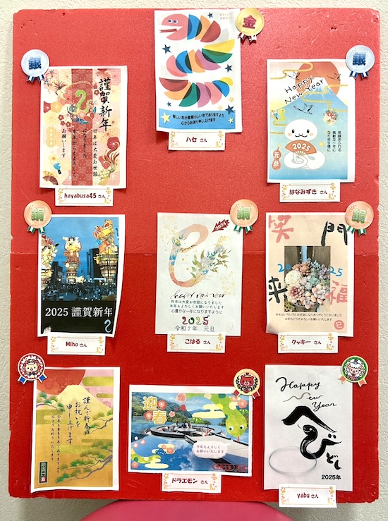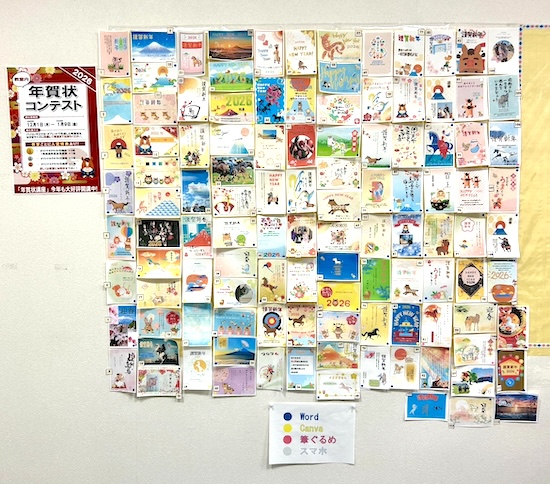 現在教室の壁には、受講生の皆さんが作成した100枚以上の年賀状がずらりと並んでいます。