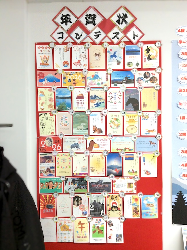教室内では、完成した力作が壁に続々と掲示され、年末らしく活気にあふれています。