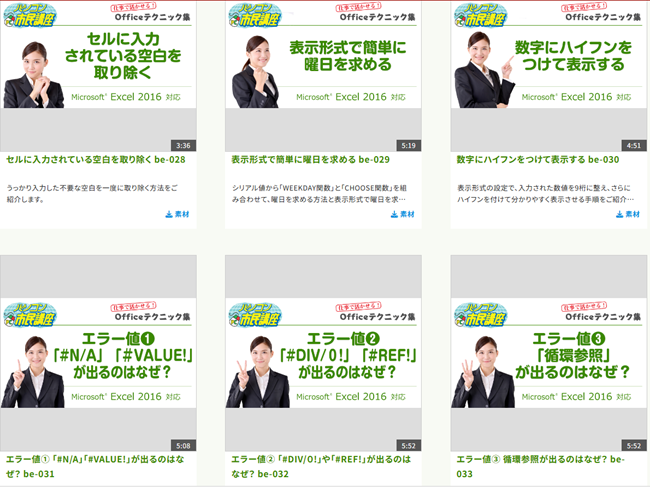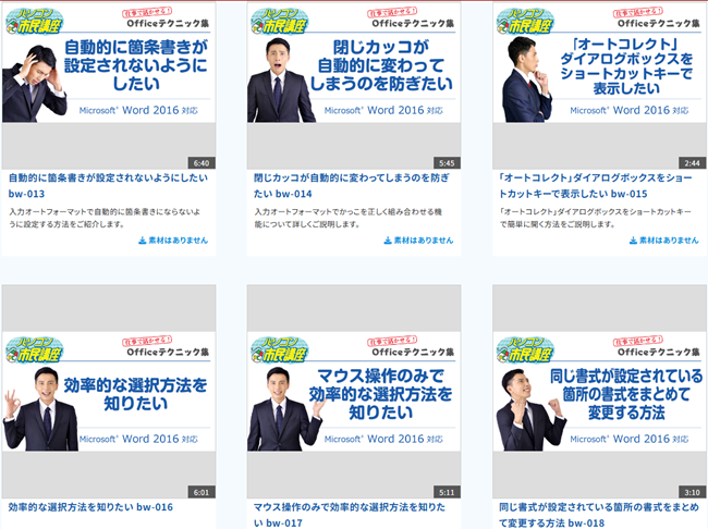 WordやExcelの「こういうこと出来たらいいのに…」「こういう時どうすればいいんだっけ?」といった細かい疑問やテクニックについて、5~10分の短い動画で効率的に学ぶことができます!
