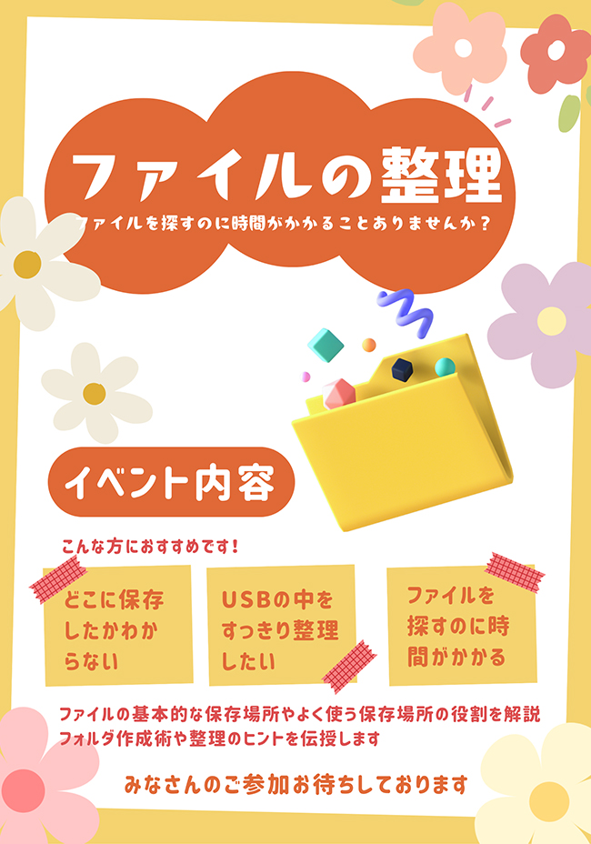 アルプラザ近江八幡教室では先日 ファイルの基本的な保存場所やその役割の解説、フォルダ作成や整理のヒントをテーマに【ファイルの整理】イベントを行いました。