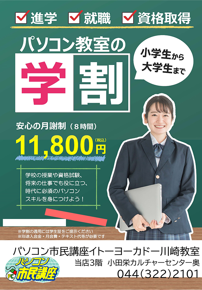 パソコン市民講座では、小学生から大学、専門学校生までが対象の学割があります。