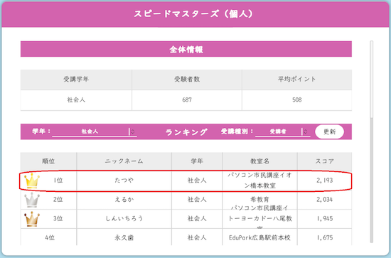 教室ランキング常連! 5月のスピードマスターズ教室対抗戦ではジュニア部門で5位に。