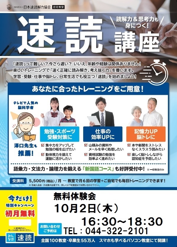 このたび【イトーヨーカドー川崎教室】では、「速読体験会」を開催いたします。