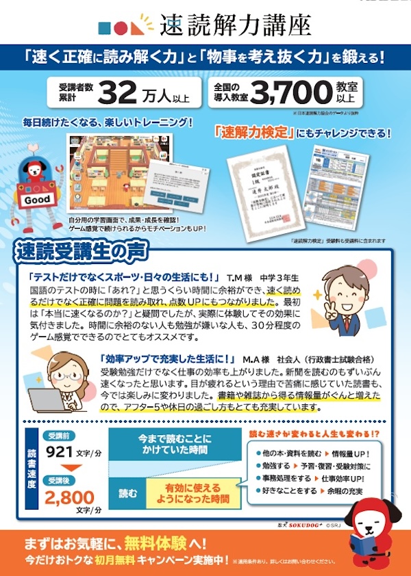 速読は、単に読むスピードを上げるだけでなく、理解力や記憶力も高め、学習や仕事のパフォーマンス向上に役立つトレーニングです。また、お子さまの読書力や学習スピードをぐんと伸ばすチャンスです!