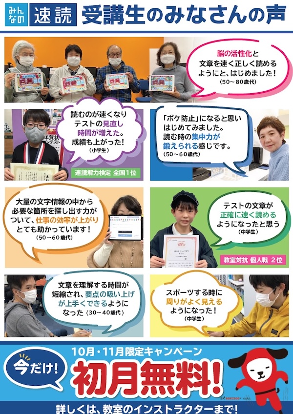 ただいま、体験して入会していただくと、初月のお月謝が無料になるキャンペーンを実施中。