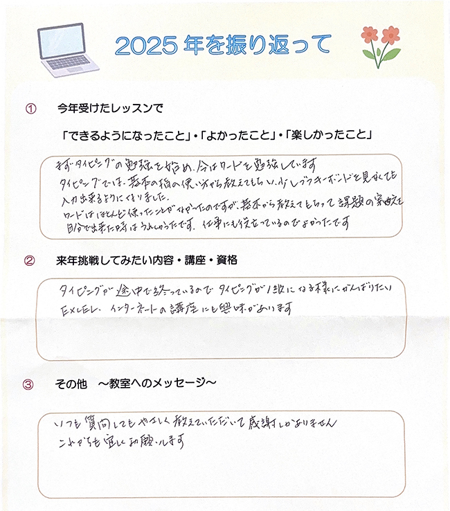 ワードはほとんど使ったことがなかったのですが、基本から教えてもらって課題の案内文を自分で出来た時はうれしかったです。仕事にも役立っているのでよかったです。