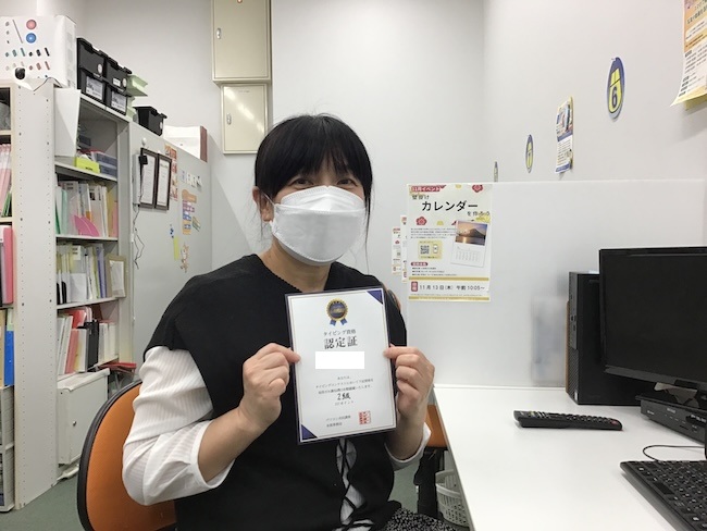 Kさんのもうひとつの大きな成長ポイントは、タッチタイピングです。最初は「キーボードを見ながら入力することすら難しかった」と振り返るKさん。しかし、練習を重ねることで、見違えるほどスピードが上がり、今ではタイピングの級も上がりました!この進歩がKさんにとって大きな自信となり、これからも上達できるように受講を続けていきたいそうです。