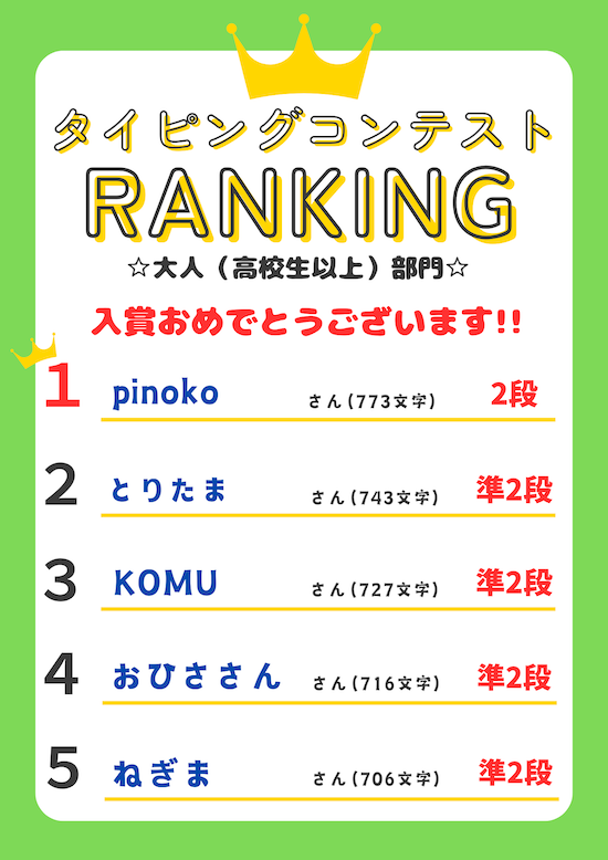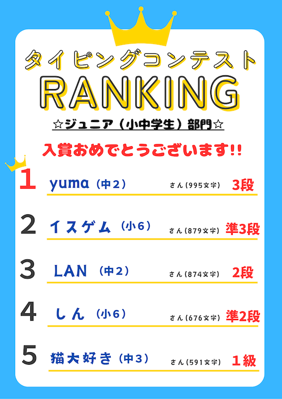今回もタイピングコンテストに向けて多くの受講生さんが昇級・昇段を目指して練習を頑張ってきました。
