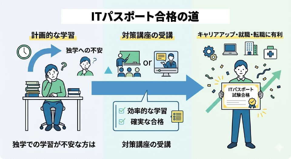 様々な業種でのキャリアアップや、就職・転職に有利とされるITパスポート試験。国家試験の中では難易度が高すぎず、比較的取得しやすいといわれる試験ですが、合格には計画的な学習が必要です。独学での学習が不安な方は、ITパスポート試験対策講座の受講を検討しましょう。