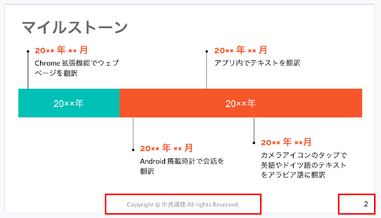 プレゼン資料において、ページ数とコピーライトの適切な配置はプロフェッショナルな印象を与えます。