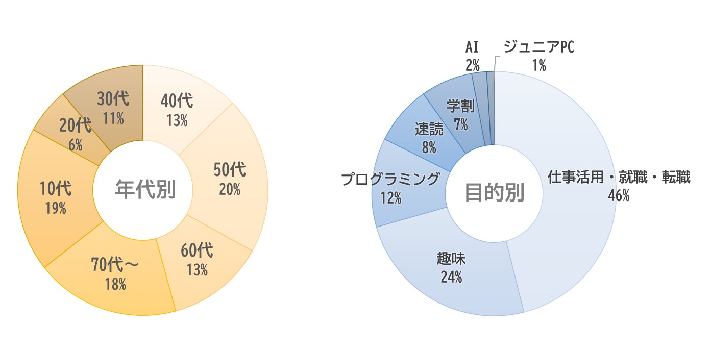 「仕事で役立てたい」「転職・就職に備えたい」といったキャリアアップから、「写真や動画を編集したい」「新しい趣味に挑戦したい」といったように、さまざまな目的でご受講いただいています。